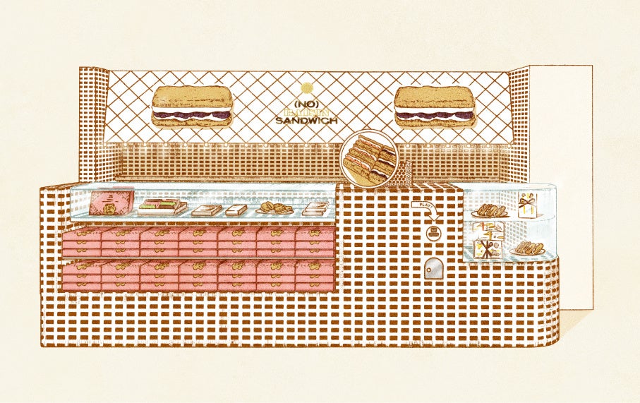 空間設計は、Wieden+Kennedy TokyoオフィスやHERMESのポップアップショップのデザイン等を手掛ける気鋭の空間設計ユニット<Kii>の新井里志氏・中富慶氏が担い、手仕事を尊ぶノーレーズンサンドイッチの菓子作りに共鳴し、「お店丸ごと焼き上げる」というコンセプトのもと、レーズンサンドイッチのサブレと同サイズの多治見タイルをオリジナルで製作。空間全体に使用するとともに、目地幅を広く取った個性的な左官仕上げは、サブレにたっぷり挟まれたバタークリームを表現。カウンターにはオリジナルのカプセルトイ機を内蔵し、遊び心溢れるブランドの 世界観と菓子を買う楽しさを最大化する仕掛けが、小さな空間にぎゅっと詰まっています。