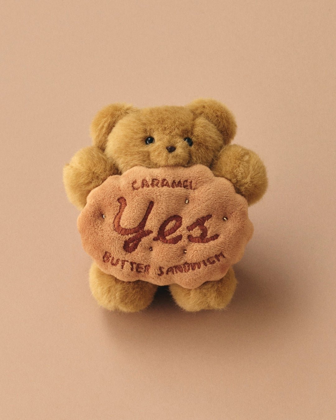 商品パッケージにはオリジナルキャラクター「キャラメルくま」をあしらい、「バターサンドにキャラメルくまがむぎゅっと合流」というユニークなストーリーを表現しています。「キャラメルくま」は、大人気ぬいぐるみ作家・mailey parlorのむらたまる氏がオリジナルで製作。一度目 が合えば二度と忘れられない愛おしさで、菓子の世界を彩ります。