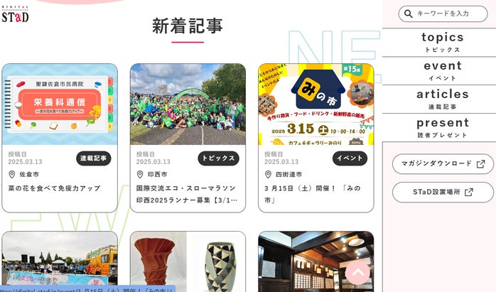 株式会社コミュニティデザイン(千葉県佐倉市)は、2025 年 4 月 1 日、千葉県北総エリアの地域メディア「DIGITAL STaD(デジタル すたっと)」を正式オープンします。フリーペーパーとして発行してきた「STaD」の創刊 20 周年に合わせ、紙のフリーペーパーからウェブメディアに完全デジタル移行します。デジタル移行に伴い、地域密着のウェブメディアとして、さらなるご当地情報の充実、ユーザーにとって有益な情報の提供を進めていきます。