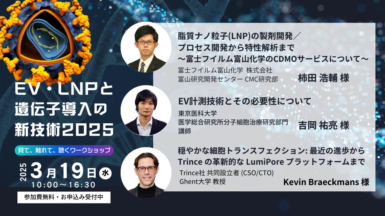 本ワークショップでは、EV(細胞外小胞)やLNP(脂質ナノ粒子)研究および、遺伝子導入技術に焦点を当て、各分野の第一人者をお招きし、最先端の研究成果や実機展示、技術動向をご紹介いたします。