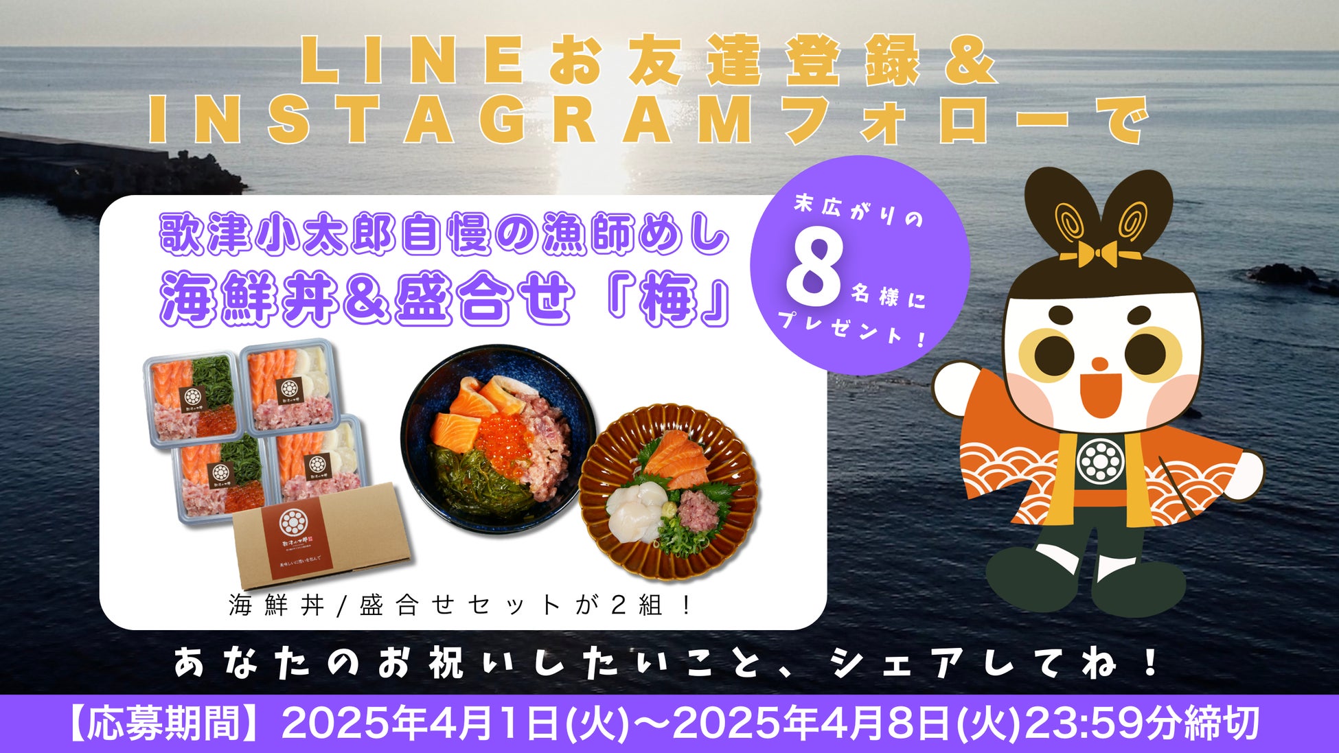 登録・フォロー&シェアしてくれた方に抽選で、末広がりの八名様に歌津小太郎自慢の漁師めし海鮮丼&盛合せ「梅」ギフトセットをプレゼント!