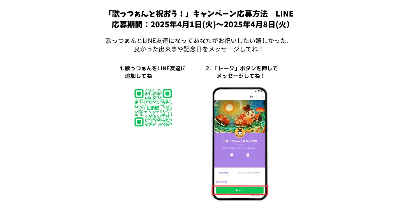 歌っつぁんとLINEで友達になって、あなたがお祝いしたい嬉しかった、良かった出来事や記念日をメッセージして教えてね!