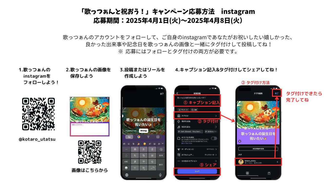 歌っつぁんのアカウントをフォローして、ご自身のinstagramであなたがお祝いしたい嬉しかった、良かった出来事や記念日を歌っつぁんの画像と一緒にタグ付けして投稿してね!
