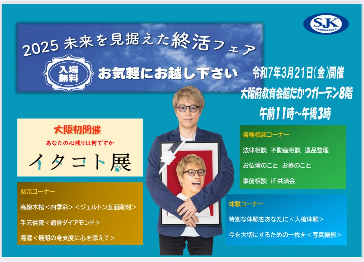 大阪府知事認可大阪葬祭事業協同組合が、2025未来を見据えた「終活フェア」を、3月21日(金)大阪府教育会館たかつガーデン8階で開催!大阪府初開催の田村 淳氏プロデュースの「イタコト展」も同時開催!