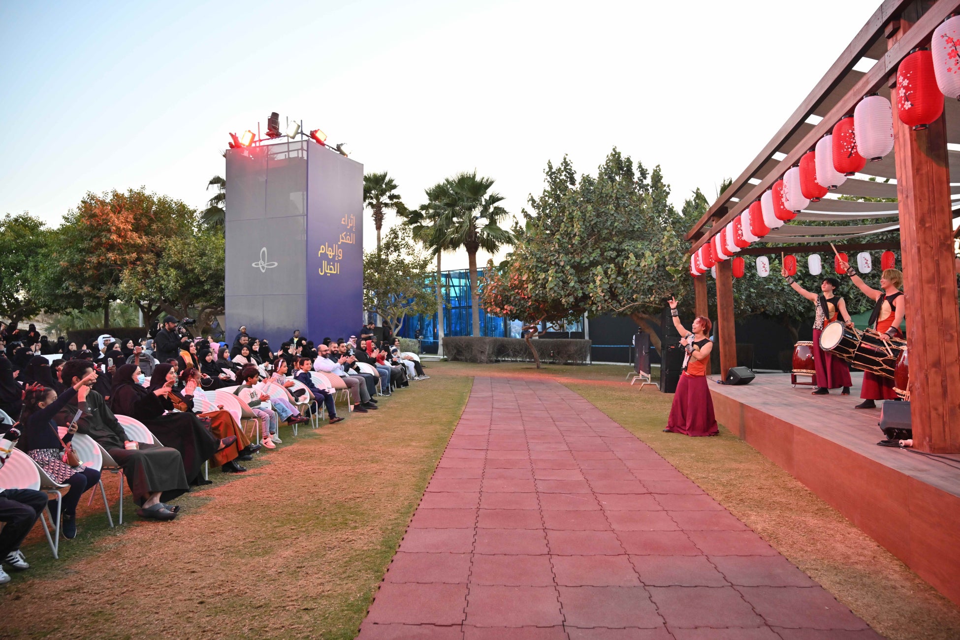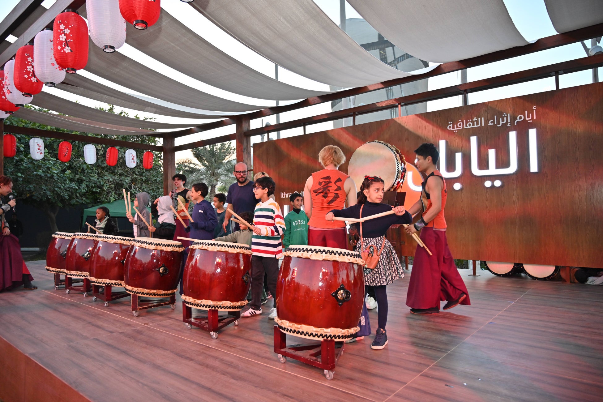 プログラムの目玉の一つとして、世界的に有名な和太鼓集団「DRUM TAO」が、Ithra内のシアターでサウジアラビア初となる公演を行いました。これまで世界500以上の都市で公演し、900万人以上の観客を魅了してきたDRUM TAOは、伝統的な和太鼓演奏に篠笛や琴のメロディー、現代的な振付を融合させた迫力あるステージを披露。日本の伝統と現代文化が見事に調和した、唯一無二のパフォーマンスで観客を魅了し、会場は大いに盛り上がり、子どもたちとの交流も行われました。