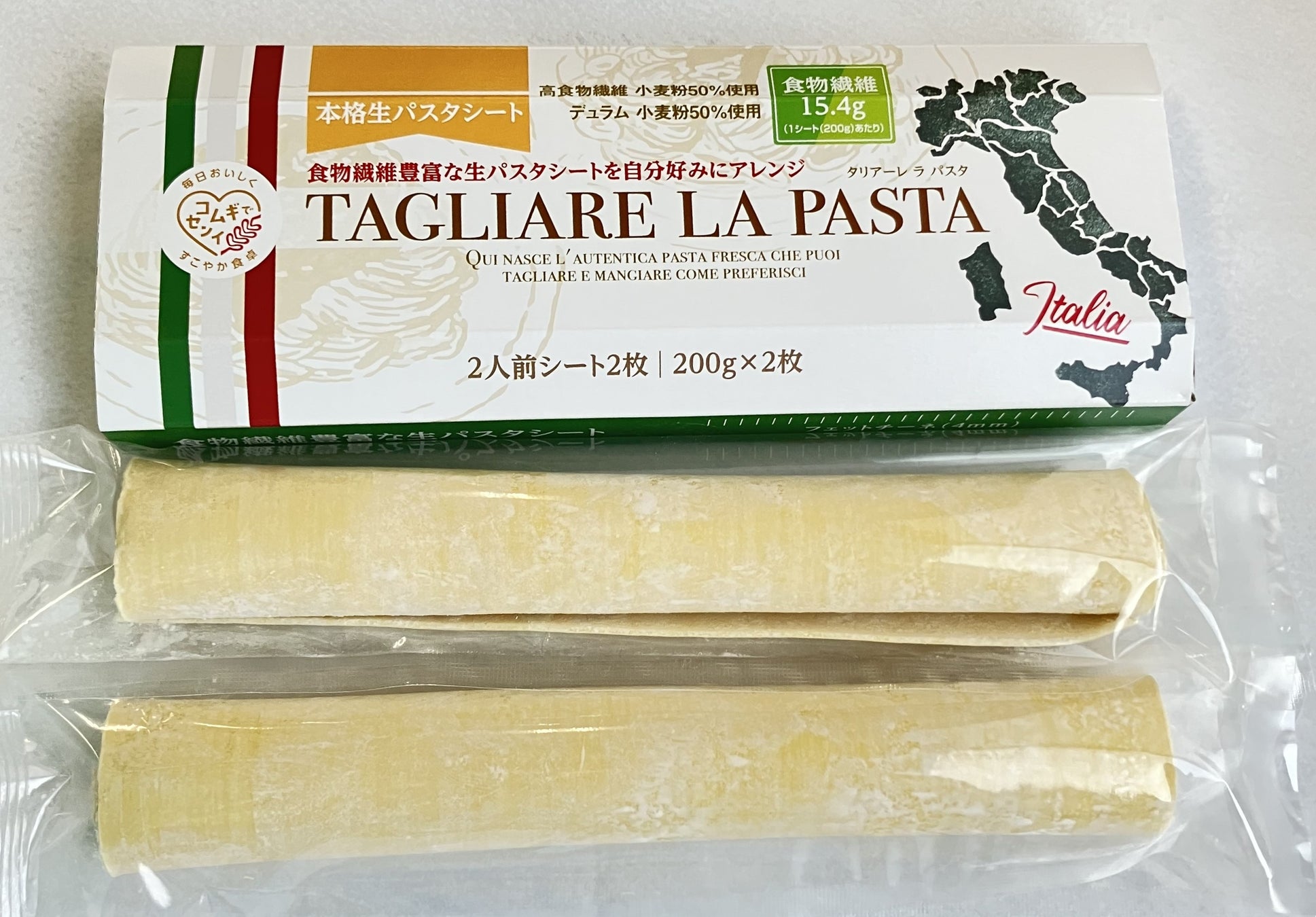 手切りでお好みの幅にカットして食べることのできる本格生パスタシート「タリアーレ ラ パスタ」日本では珍しい生パスタシートで、高食物繊維小麦を使用した日本初の商品です。