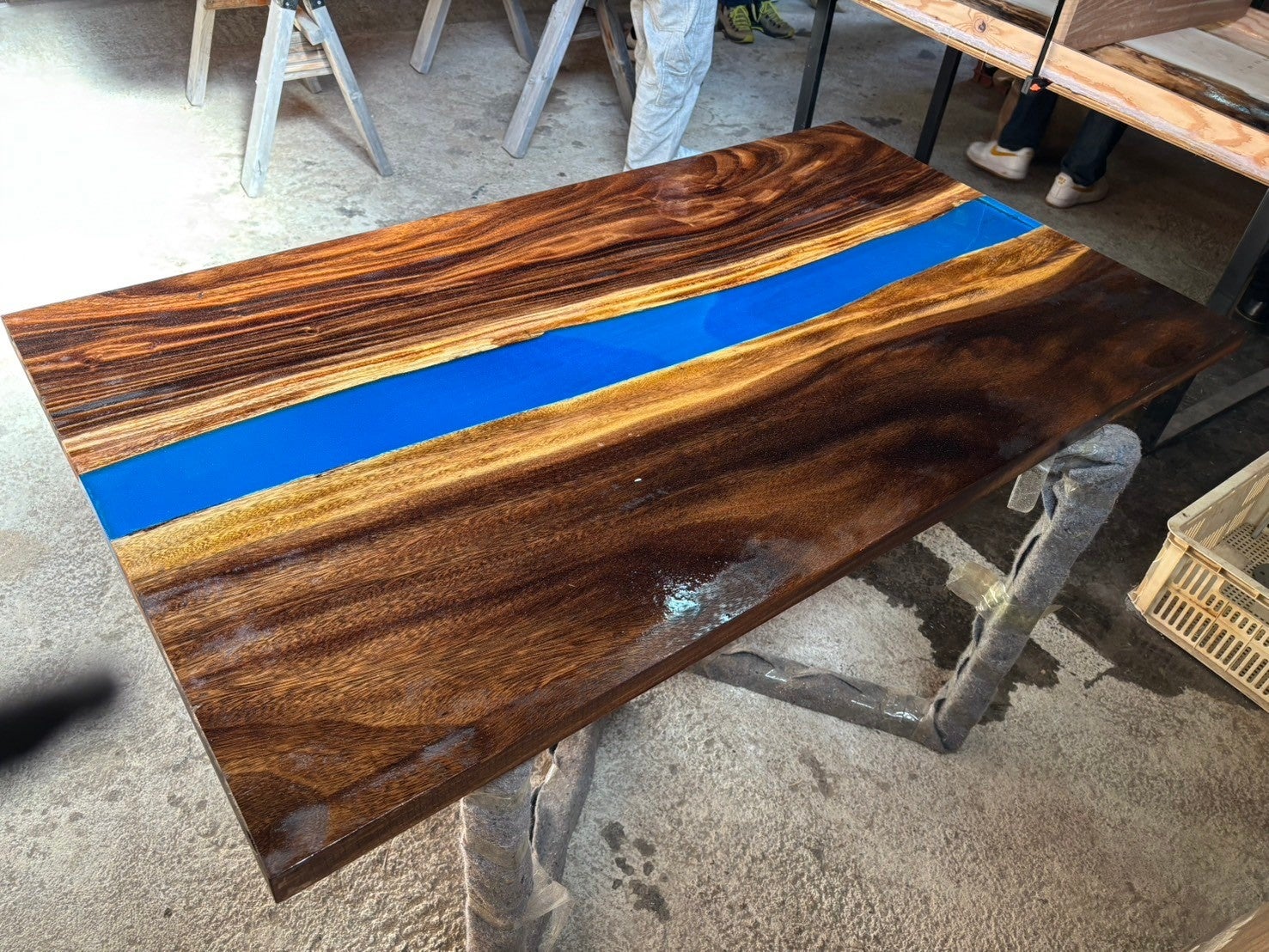 ワークショップは 木材の選定 → デザイン決定 → レジン流し込み → 研磨・仕上げ という流れで進行します。各工程でしっかりとレクチャーを行い、初めての方でも無理なく作業を進められます。
