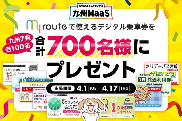 一般社団法人九州MaaS協議会は、4月1日(火)よりトヨタファイナンシャルサービス(株)が運営する「my route(マイルート)」アプリにてご利用いただける「デジタル乗車券プレゼントキャンペーン」を実施いたします。