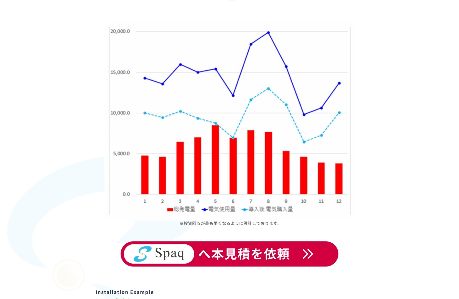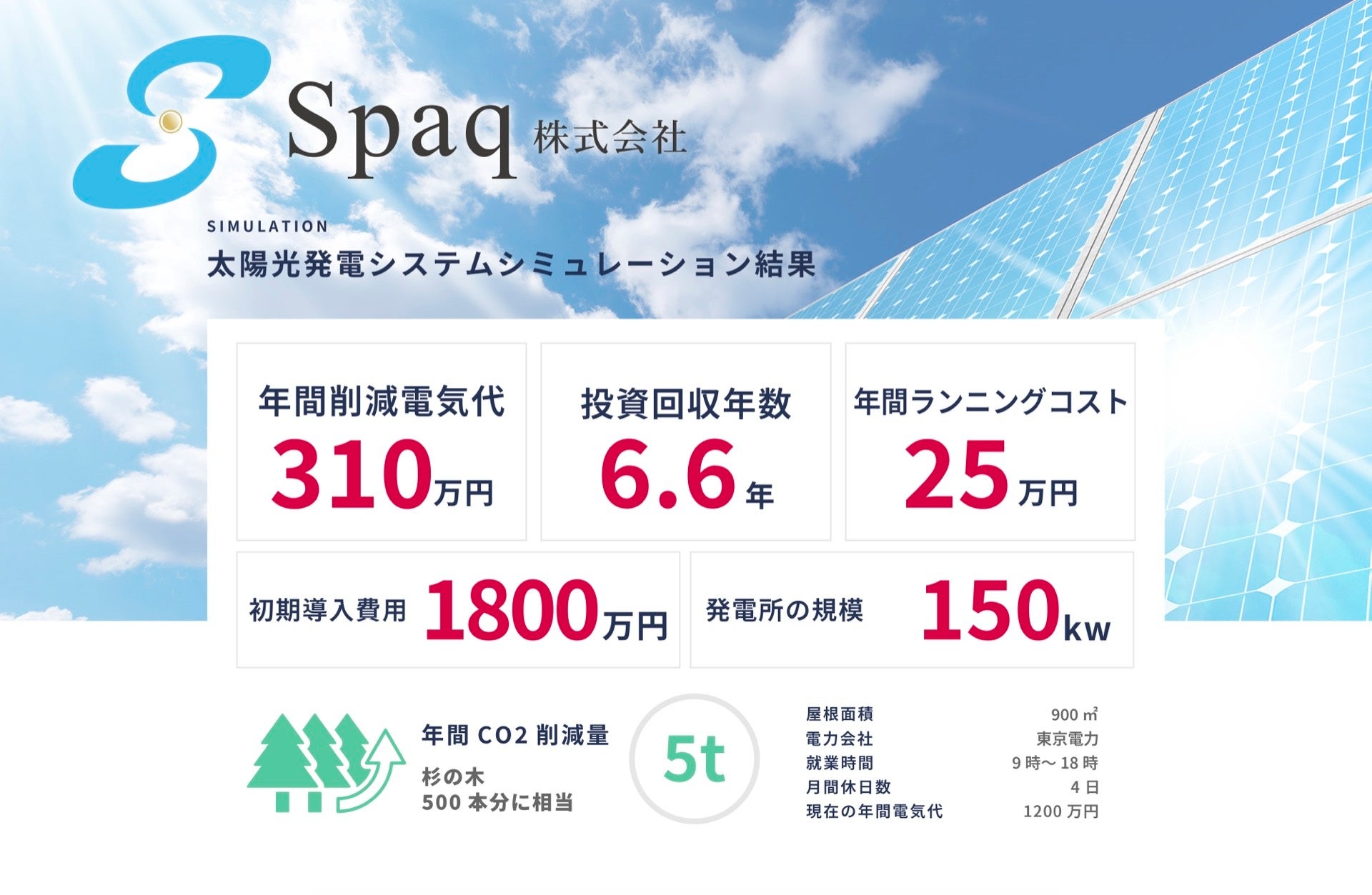 近年、太陽光発電の自家消費型の導入ニーズは高まっているものの、費用が不明瞭であるといった背景から、導入の検討しがしづらいという問題がが顕在化していました。Spaq株式会社では、この課題を解決するため、10年間自社で設計から施工までワンストップで行っていた経験を経て、お手元のパソコンや、タブレット端末で簡単に簡易見積もりができるアプリケーションを開発いたしました。