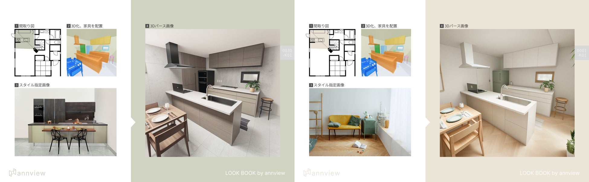 壁や家具などの色を一つ一つ指定するのは大変ですが、annviewでは好きなインテリア画像をアップロードして指定するだけで、そのスタイルを反映した画像を作成します。