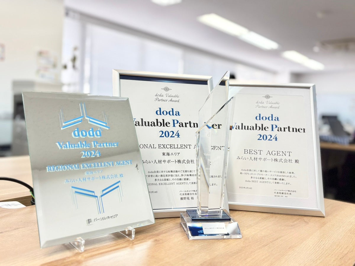 人材紹介・転職支援サービスを運営するみらい人材サポート株式会社(本社:愛知県名古屋市中区丸の内)は、パーソルキャリア株式会社が主催する『doda Valuable Partner Award 2024』において、約650社のdodaパートナーエージェントの中から高い専門性と豊富な転職支援実績が評価され、以下部門に受賞いたしました。