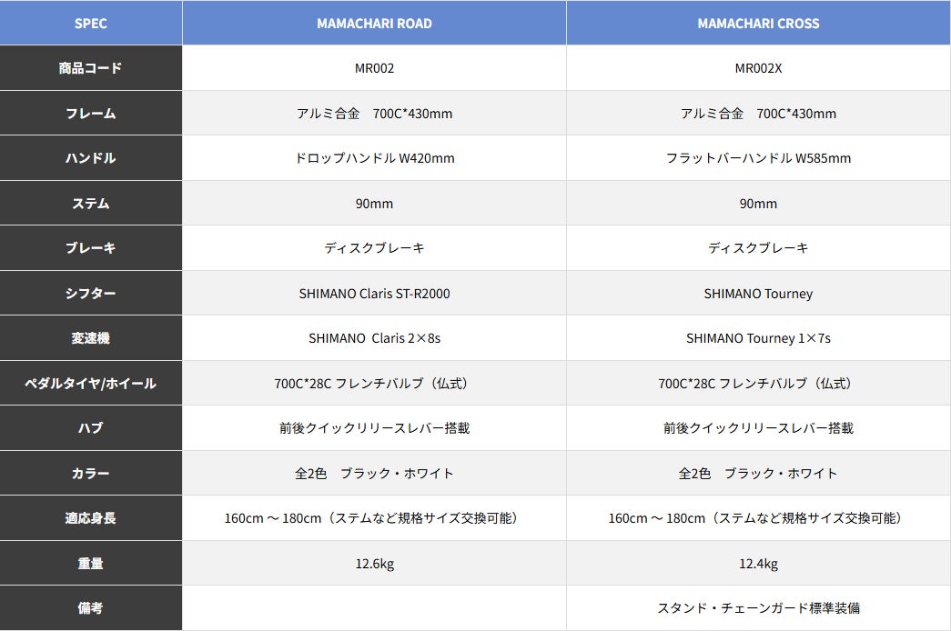 『MR002』は、初代ママチャリロードのMakuakeやその後の販売、試乗イベント等で頂いたお客様の声をもとに好評頂いた部分は残しつつ、改良を重ね、「より速く・より快適に」を目指し二種類のタイプをご用意。