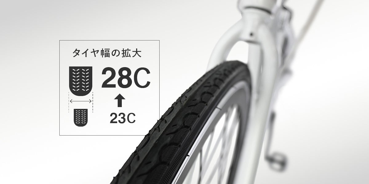 初代ママチャリロードのタイヤ幅23Cから28Cに拡大することで、路面との接地面が増え、安定性が高まりスピーディーな走行を楽しめます。