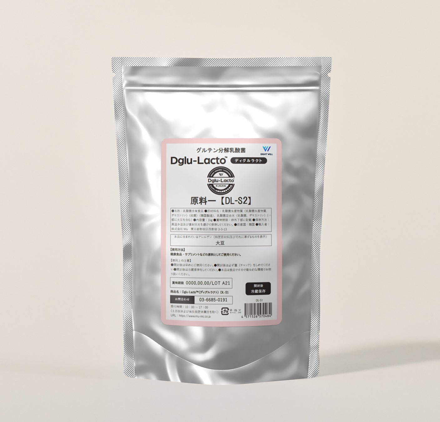 グルテン分解乳酸菌(生菌)と、その乳酸菌が産生する代謝物を含むDL-S1を配合したサプリメント。カプセルと顆粒タイプ2種展開。