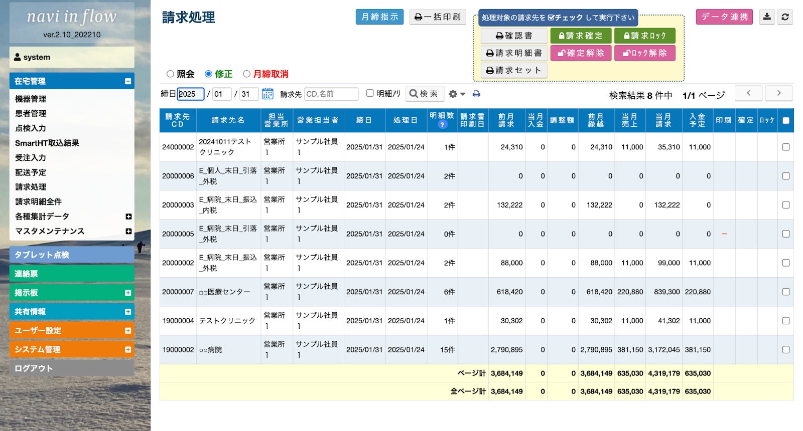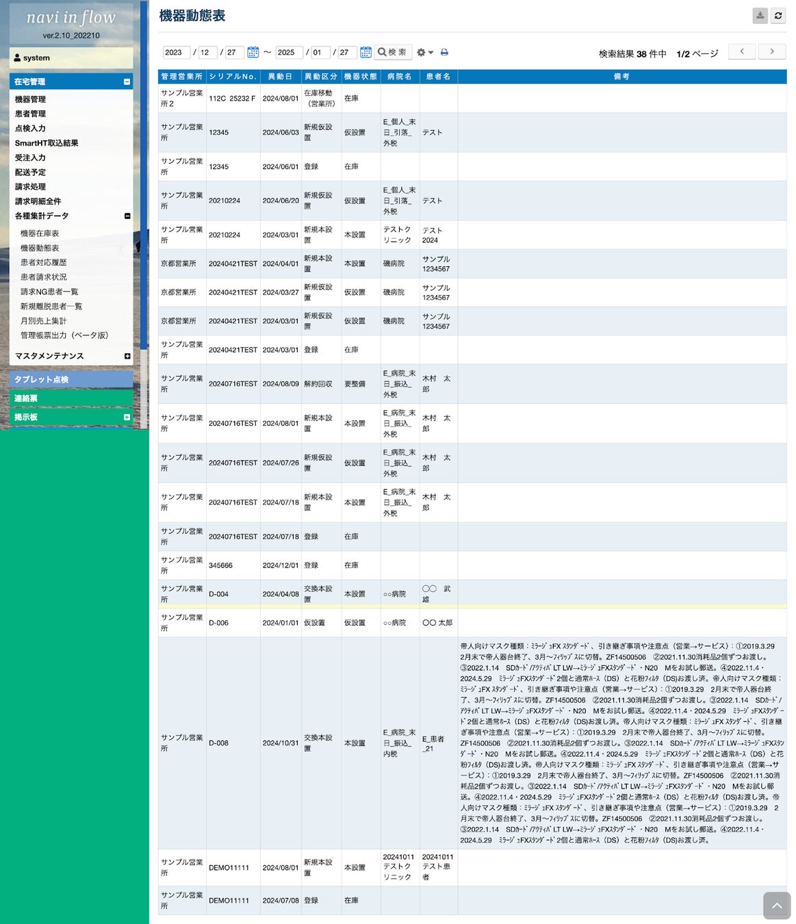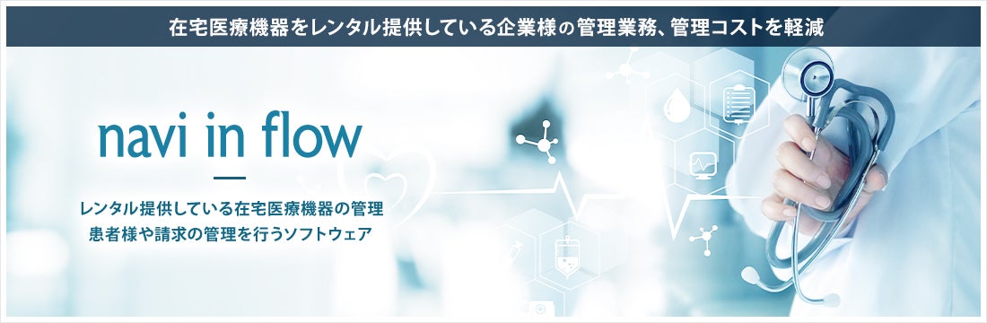 「navi in flow」は、在宅医療機器のメーカー様、ディーラー様向けの管理システムです。全国の在宅医療機器メーカー様、ディーラー様での導入実績があり、最初の導入企業様には10年以上ご利用いただいています。各地域の独自性にも対応可能な豊富なノウハウを保有しています。