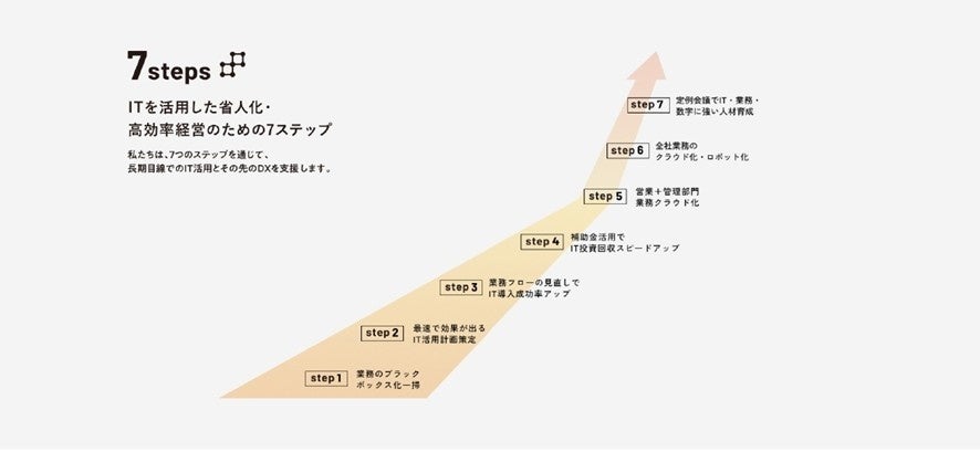 IT知識がなくても安心して始められる独自の「7steps」フレームワークで、ITを活用した業務の効率化・人手不足向上・収益向上を実現します。