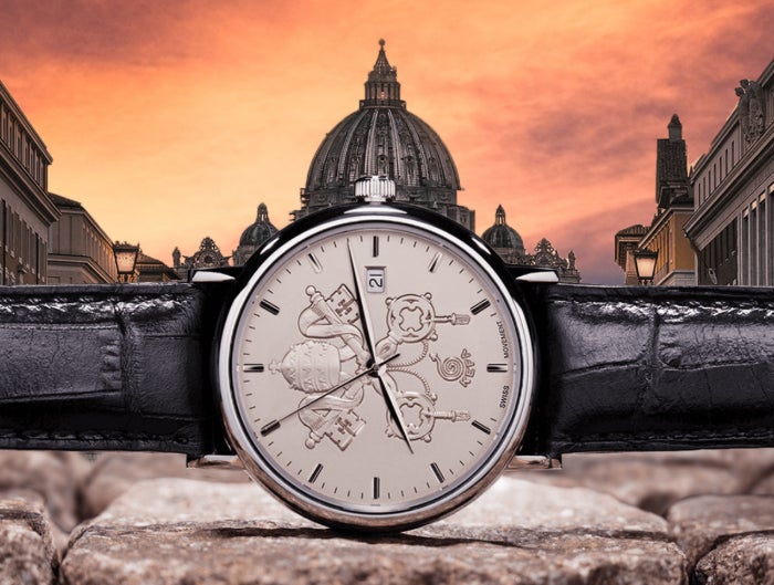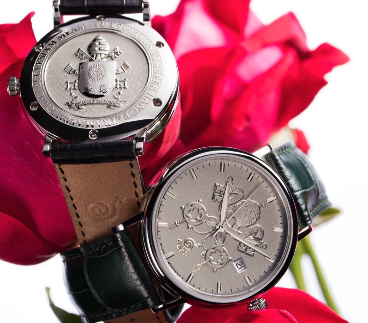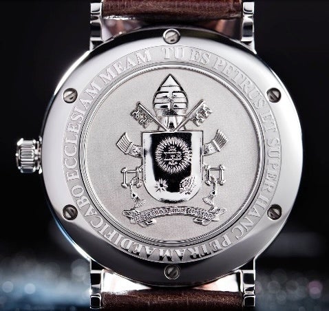 腕時計「ペトゥルス Petrus」は、バチカン市国の紋章が文字盤に、教皇フランシスコの紋章が裏蓋に施されたデザインが特徴です。