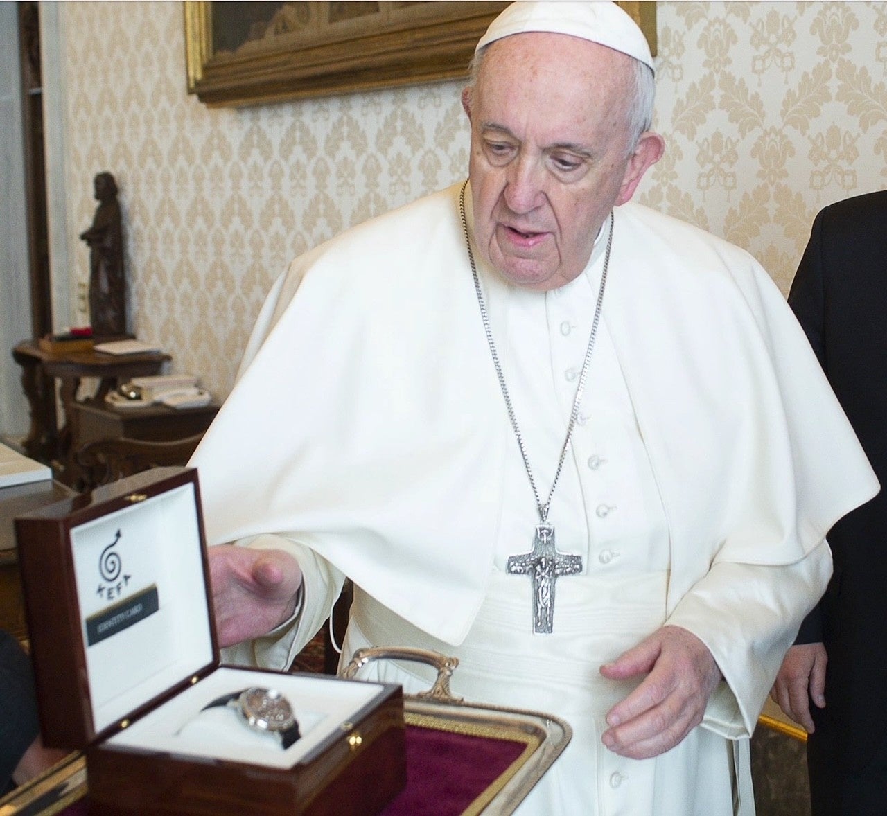 バチカン市国と教皇フランシスコの紋章が彫り込まれた腕時計「ペトゥルス」は、1本1本にシリアル番号が付きます。10%の収益は慈善活動に充てられることから、「ペトゥルス」は特別な価値を持つだけでなく社会貢献も果たします。