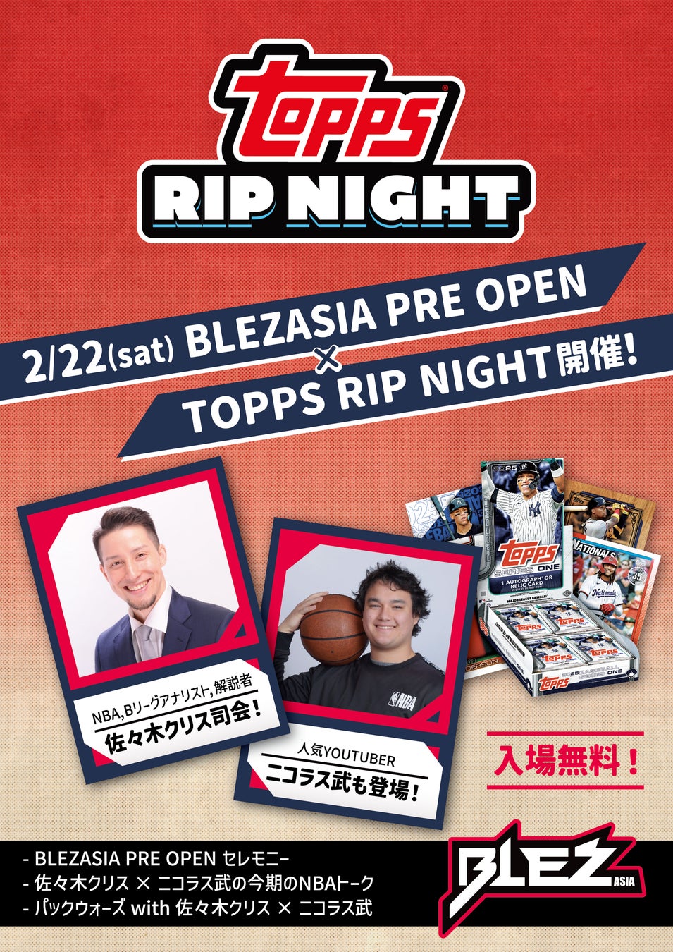 BLEZASIA × TOPPS RIP NIGHT開催!佐々木クリス&ニコラス武が登場!小学生以下参加費無料!