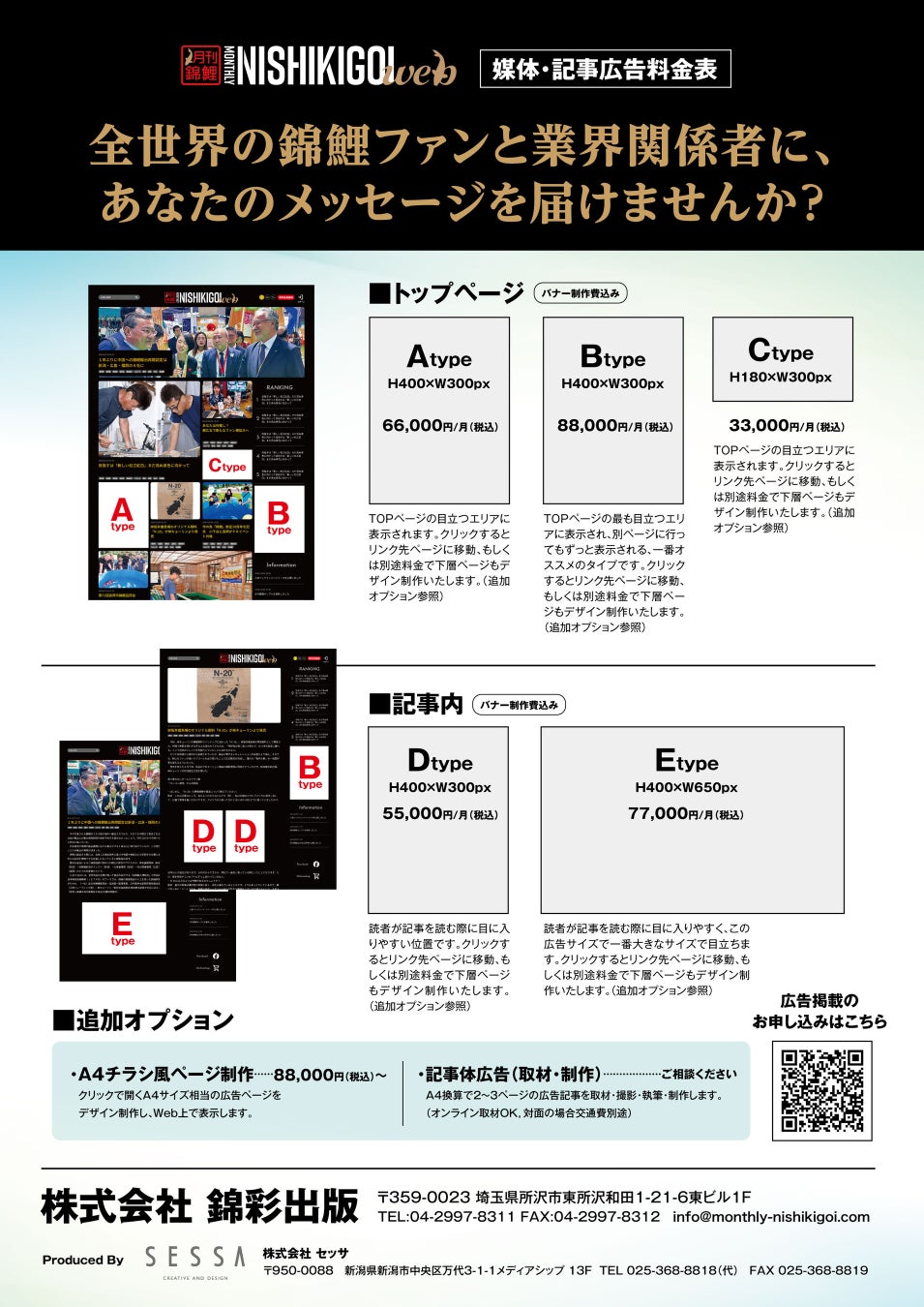 また、 全世界の錦鯉愛好家・業者に向けた広告掲載も可能です。日本語・英語・中国語の3カ国語対応により、グローバル市場に強くリーチ。 「月刊錦鯉WEB」を活用した情報の収集・発信をあなたもぜひ!