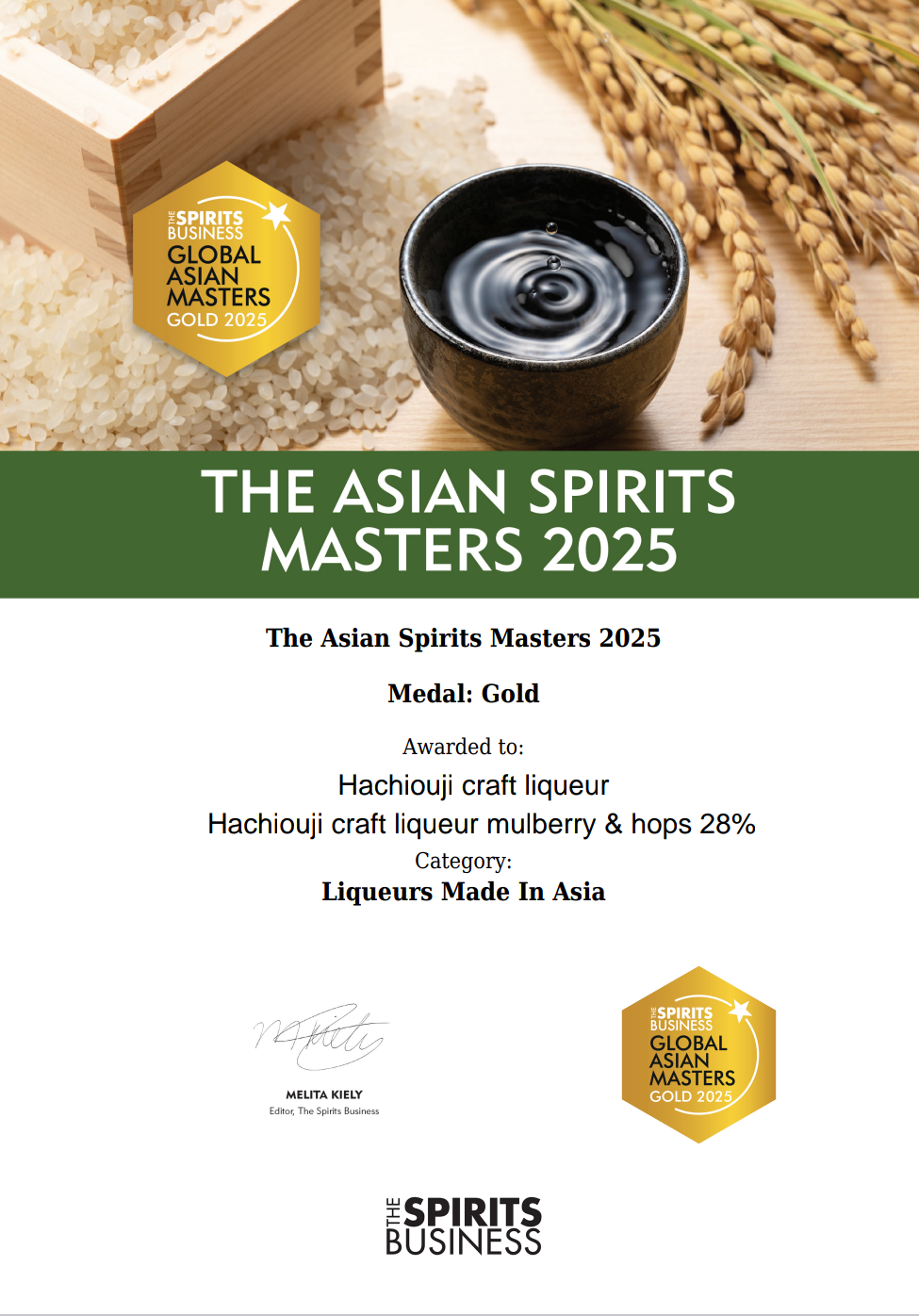八王子クラフトリキュールの「mulberry & hops 28%」は同コンペティションの「リキュール部門」で、部門最高点のゴールドを獲得しました。