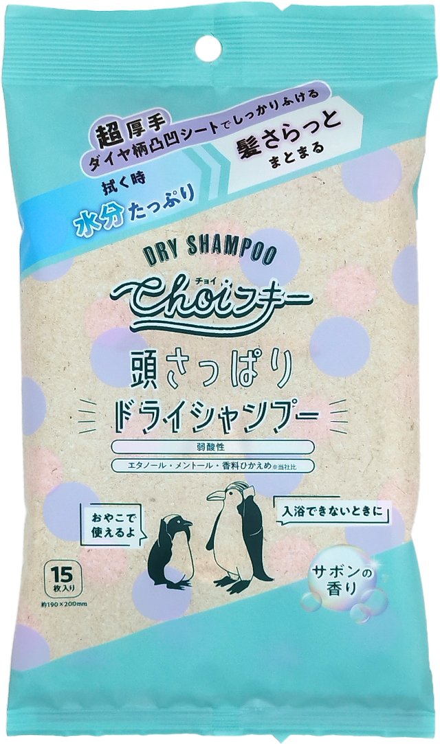 「CHOIフキー 頭さっぱりシャワータオル サボンの香り」は、入浴できない時に使えるドライシャンプーです。ダイヤ柄の凸凹シート仕様で、髪や肌にやさしく、しっかり汚れを拭き取れる設計となっています。水分をたっぷり含みながらも、使用後は髪がさらっとまとまります。頭だけでなくからだにも使えます。