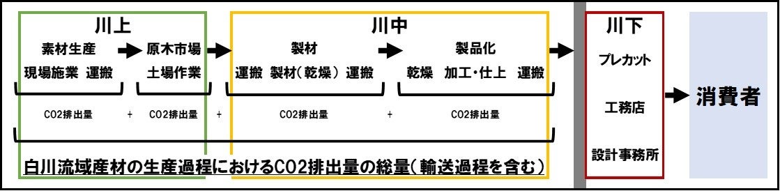 今や無視できない環境問題に木材業界はどのような方向から貢献していけるのか、当組合では2020年のウッドショックを皮切りに模索し続けてきました。そこで、環境に関して意識を持つうえで基本的なことである、自社の製造・販売過程におけるCO2排出量を把握することから動き始め、白川流域から生産される木材を、これからも自信をもってユーザーの皆様に届けるために、白川ローカルサプライチェーン(Local Supply Chain:以下、白川LSC)を構築している川上・川中の事業体と協同組合で連携を取りながら、CO2排出量の把握に努めていきます。CO2排出量から環境問題へのアプローチを白川LSCに賛同する川下事業体も含め実践していきます。