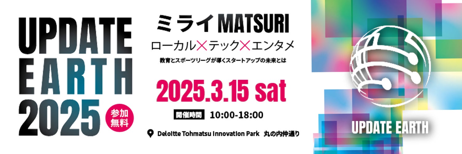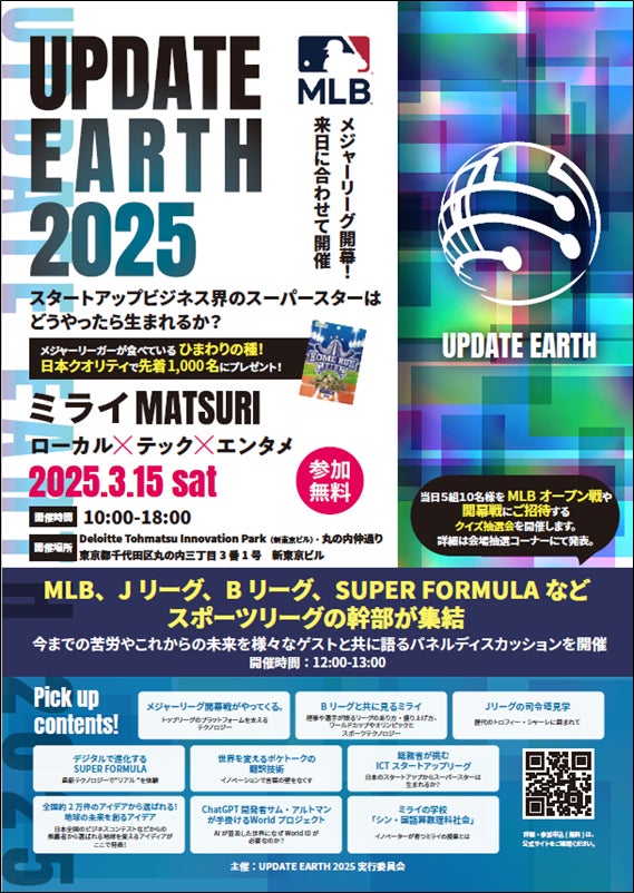 一般財団法人UPDATE EARTH(千代田区、理事長:福田正)は、日本から世界を変えるスタートアップ界のスーパースターを育てるため、米国スポーツのトップリーグであるMajor League Baseball(メジャーリーグベースボール:以下、MLB)とパートナーシップを組み、日本のトップスポーツリーグと共に、教育をサブテーマとしたイベント「UPDATE EARTH 2025ミライMATSURI」を2025年3月15日(土)に東京都千代田区丸の内新東京ビル及び丸の内仲通りを中心に開催します。(入場は全て無料)