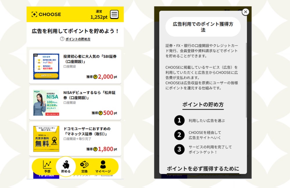 CHOOSEでは、証券口座開設や投資関連サービスの利用を中心とした広告を掲載。投資初心者にマッチした高単価案件(数千~数万ポイント)が揃っています。また、投資予想ゲームをきっかけに、投資に興味を持ったユーザーを広告主へ送客して、本格的な株式投資の第一歩をサポートします。