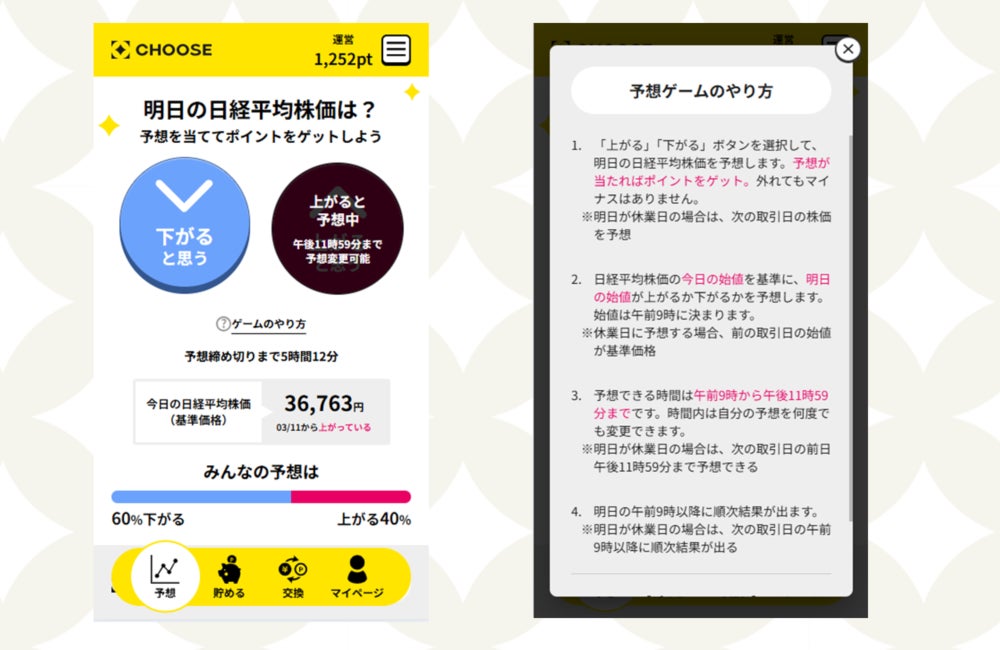 CHOOSEは、「明日の日経平均株価が上がるか?下がるか?」の2択を予想するだけで、投資を体験しながらポイントを獲得できるサービスです。予想が当たるとポイントが付与され、外れてもポイントが減ることはありません。