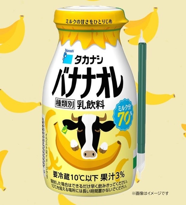 商品は、どこか懐かしく親しみやすいデザインの200mlの牛乳ビン型PETボトルに入った飲料シリーズです。シーンに合わせて、ストローでスマートに飲むことも、キャップを取って広口でゴクゴク飲むこともできる2WAY仕様です。「タカナシ バナナオレ」は、ミルク分70%とミルクリッチに仕立てました。ミルクとフルーティーなバナナの味わいがマッチした、一息つきたい時におすすめの乳飲料です。