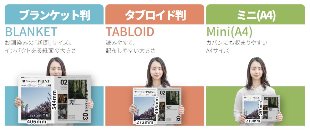 今回のリニューアルでは、従来のブランケット版(通常の新聞サイズ)、タブロイド判に加え、A4サイズの3つのサイズ展開をご用意。お客様の用途に合わせて柔軟にお選びいただけます。また、3つの印刷スタイルメニューを新たに導入いたしました。