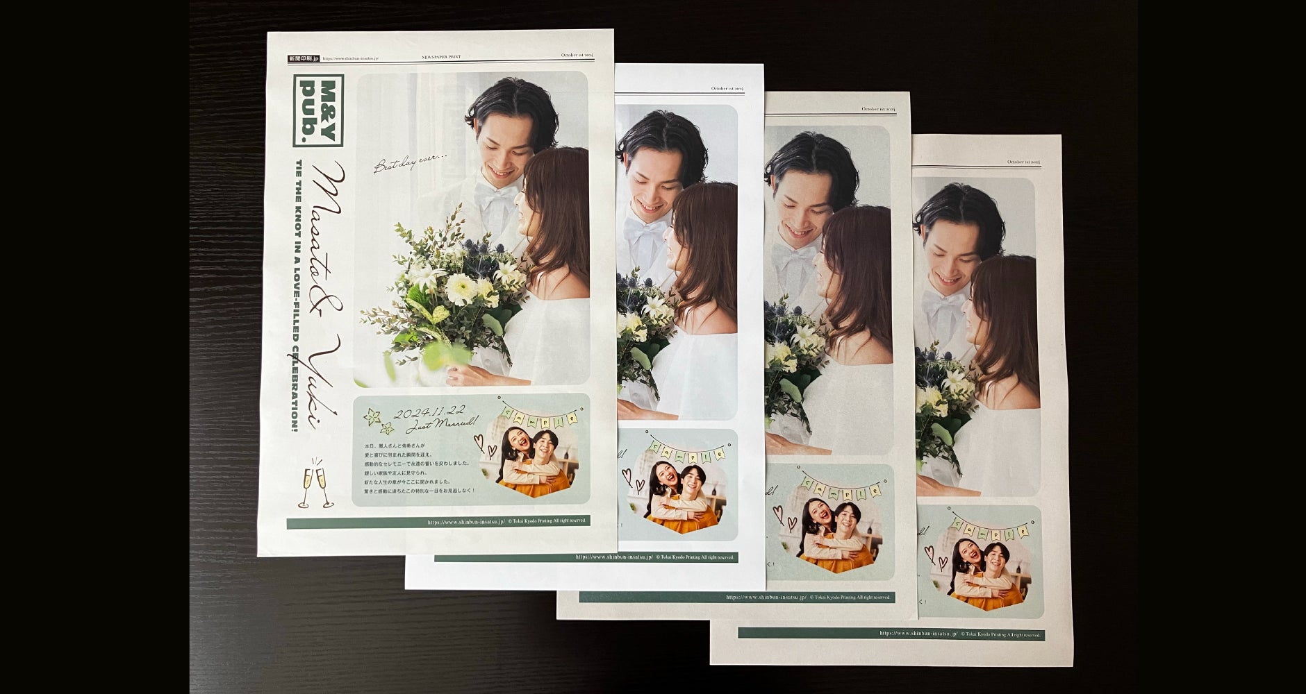 新聞輪転機で印刷するビンテージ新聞印刷は、実際の新聞と同じ用紙と製法で、時代を感じるような質感を届けます。自然乾燥のインキが紙にしっとりと染み込み、ほんの少し滲んだ網点が、写真や文字にビンテージの味わいを加えてくれます。普通の印刷では出せない、記憶に残る紙面を演出します。
