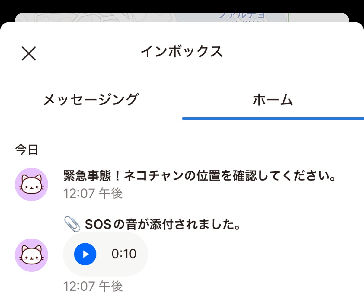 iシェアリングのSOSアラート機能にが有効になっていれば、SOS通知が周辺の音と共に届くようになります。