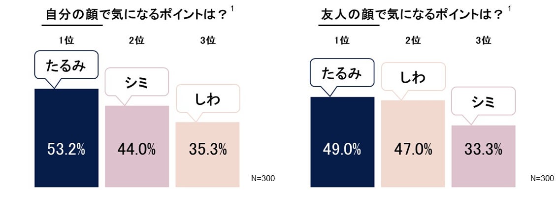 見た目年齢に影響する肌悩みにはさまざまありますが、調査によると自分が気にしているポイントと、他人の顔で気になるポイントが異なる結果でした(※1)。特に大きな差があるのがシミとしわ。自分ではシミのほうが気になっていても、周囲からはしわのほうがよく見られているという結果でした。同様に、写真による別の調査でも、シミとしわのある女性の顔からシミを無くすと1歳若く見える結果に対し、しわを無くすと10歳若く見え、見た目年齢に関して、しわのほうがシミよりも有意に影響することが示されました(※2)。