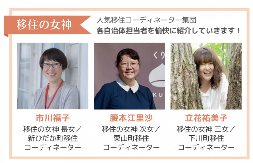 移住系youtubeで人気の「移住の女神」。道内いろいろなまちを知り尽くした3人の目線で、全参加自治体をイベント中に回り面白おかしく紹介していきます。
