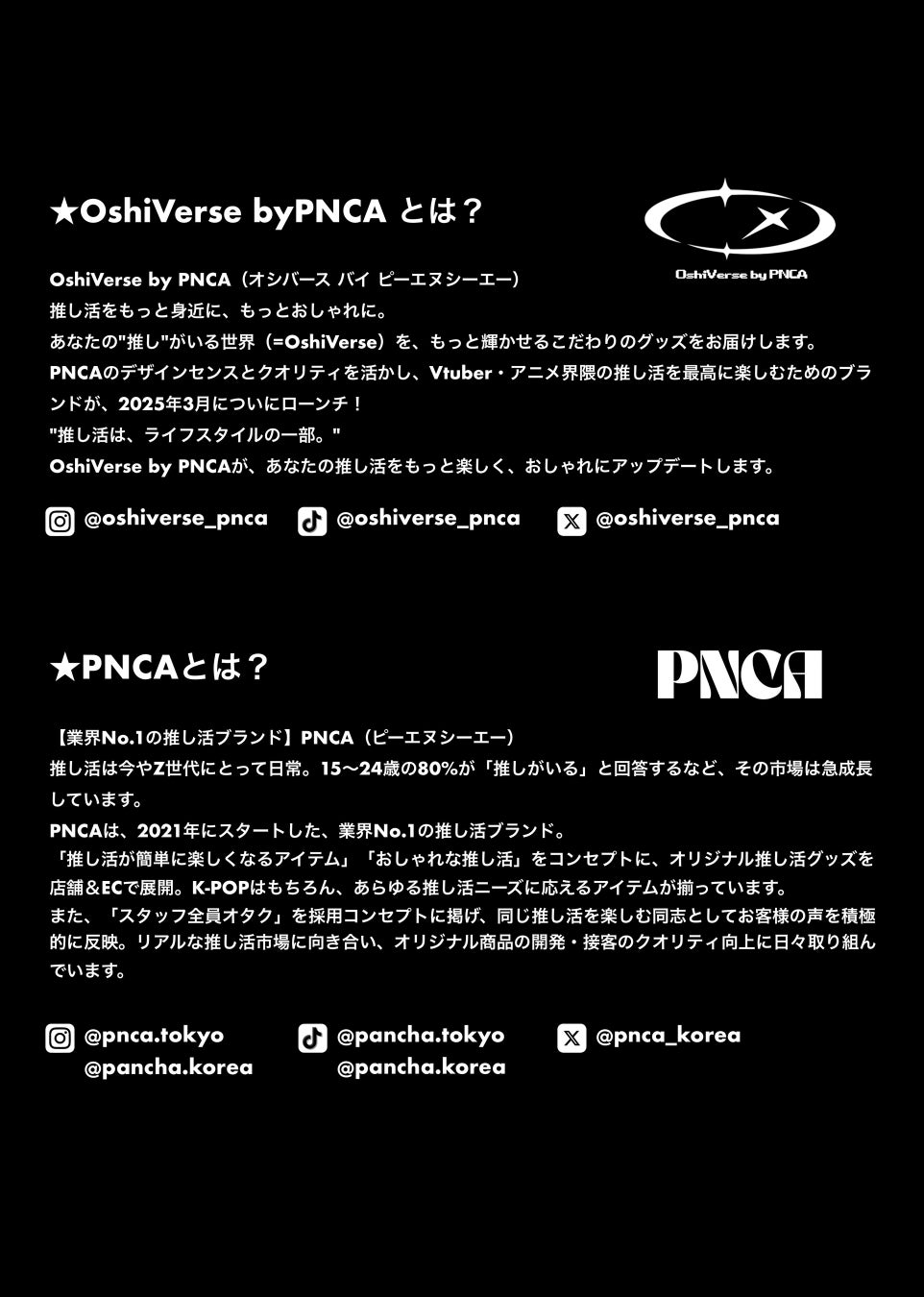 コメント : PNCAさんの魅力を最大限に活かしつつ、界隈との相性を考慮したサイズやカラー、あったら嬉しいと思えるアイテムをご提案させていただきました。私のアイデアをもとに、“手に取りやすさ”と“かわいさ”を両立した商品に仕上げてくださり、本当に感謝しています。推し活の合間にも立ち寄りやすい渋谷モディで、Oshiverseを通じて皆さんの“推し”への愛がますます深まることを願っています。大切な推しとの素敵なひとときを、どうぞ存分にお楽しみください。