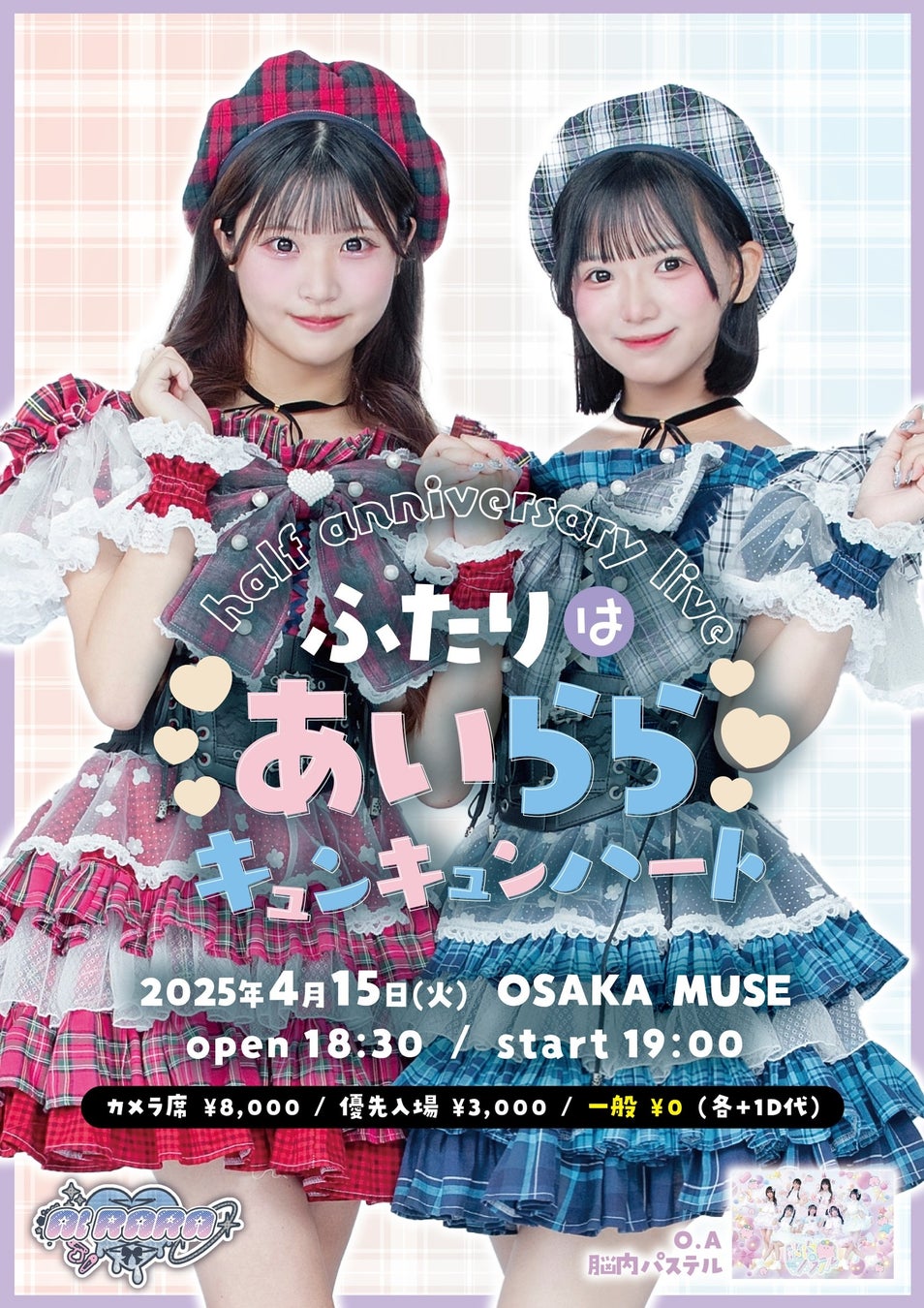 関西を拠点に活動しているAI♡RARA(あいらら)が、2025年4月15日(火)に心斎橋にあるOSAKA MUSEにて一般チケット無料の半年記念ワンマンライブ『ふたりはあいらら キュンキュンハート』を開催!