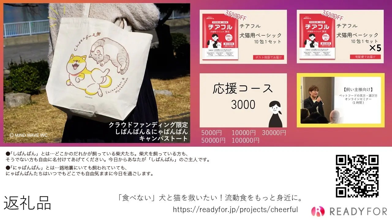 流動食チアフルをお届けする以外にも、私どもの取り組みにご賛同いただける方々にぜひご愛用いただきたい返礼品として、人気キャラクター「しばんばん&にゃばんばん」の本クラウドファンディング限定描き下ろしイラスト入りキャンバストートをご用意しました。作者である オオゴシ ヤステル様はじめ株式会社マインドウェイブ様が本プロジェクトにご賛同くださり完成した、唯一無二の返礼品となっております。その他、獣医師向け、飼い主様向けセミナーを返礼品としてご用意しております。