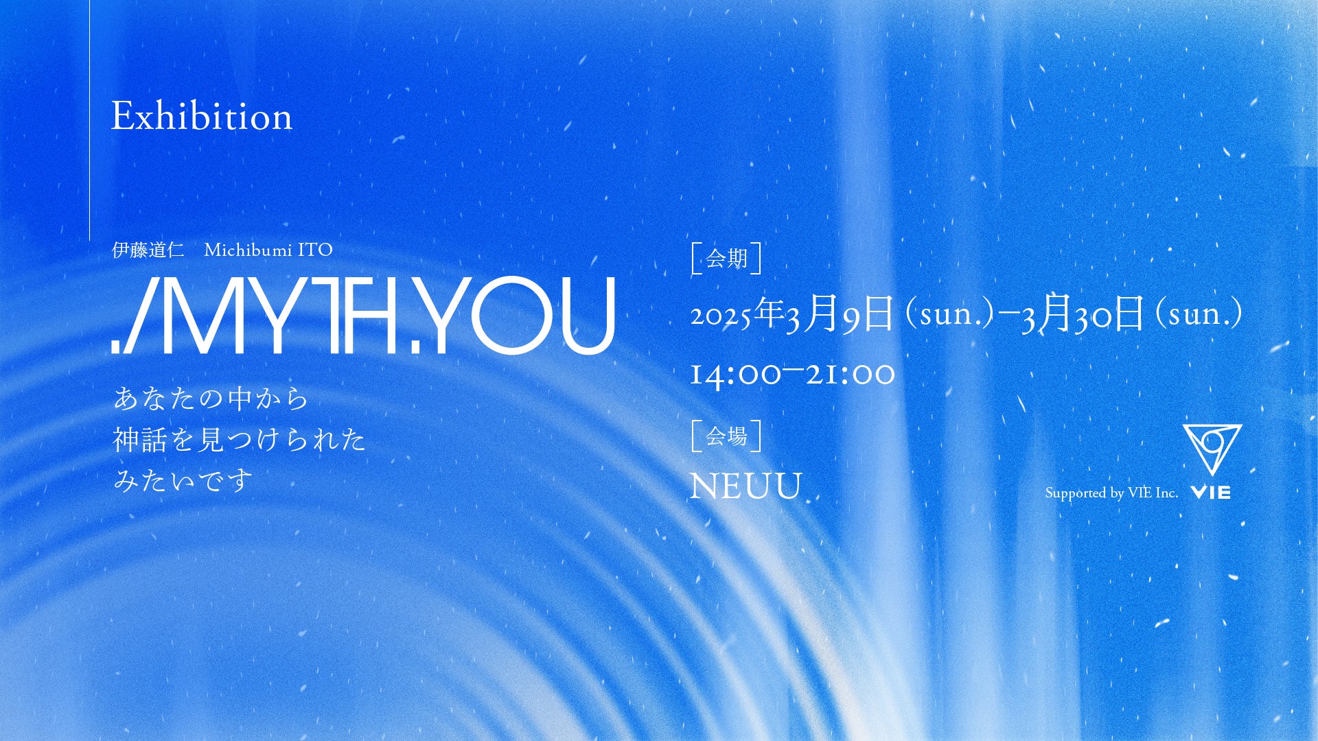 新宿・NEUUにて、2025年3月9日(日)よりVRや詩を用いて、VR・AR作品を発表し、先端技術を用いたセンサリングや、インタラクションの詩学・美学を探求してきたアーティスト・伊藤道史がプロジェクト「./MYTH.YOU あなたの中から神話を見つけられたみたいです。」を始動。VR作品では、次世代型ウェアラブル脳波計の開発とニューロテクノロジーの社会実装を行うVIE株式会社(本社:神奈川県鎌倉市、代表取締役:今村 泰彦、以下、VIE(ヴィー)」がBMIプログラムの開発・デバイスの協力を行う。