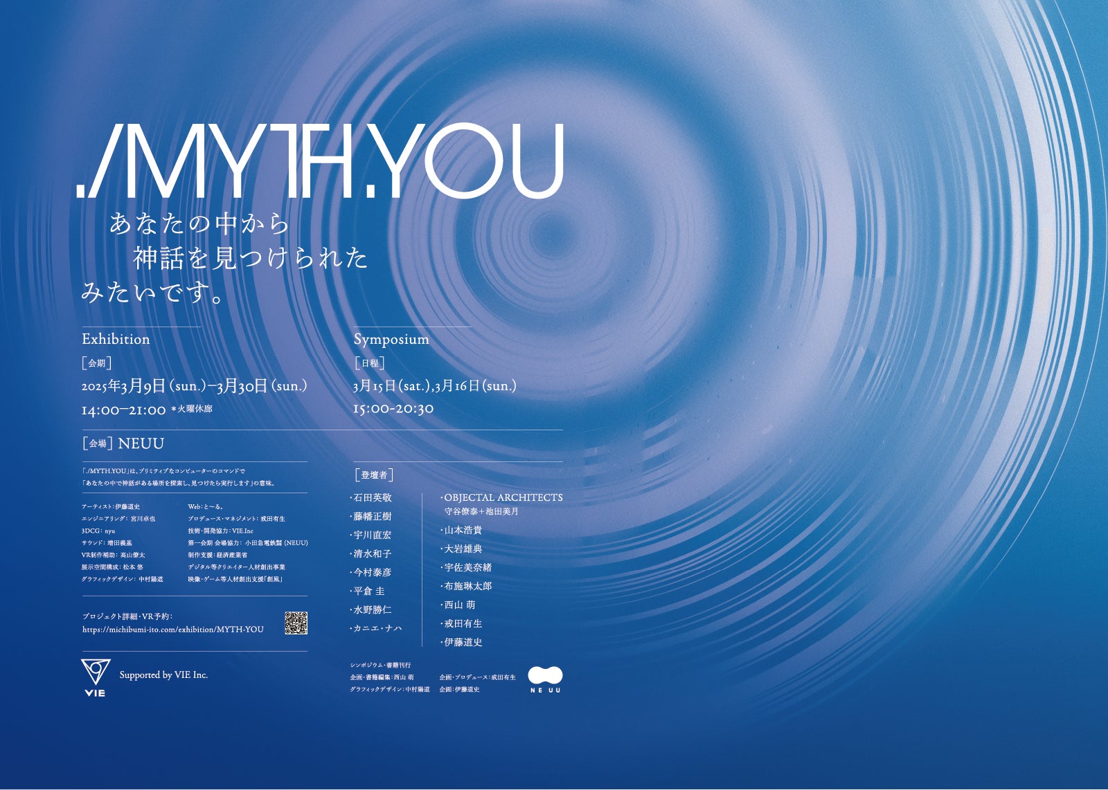 VR作品展示、シンポジウム、出版という3つの軸を通して、現代の映像・メディアを用いた芸術と、世界認識や文化構築の基盤についての対話・議論を深めることを目指しています。「./MYTH.YOU」は、プリミティブなコンピューターのコマンドで「あなたの中で神話がある場所を探索し、見つけたら実行します」の意味。