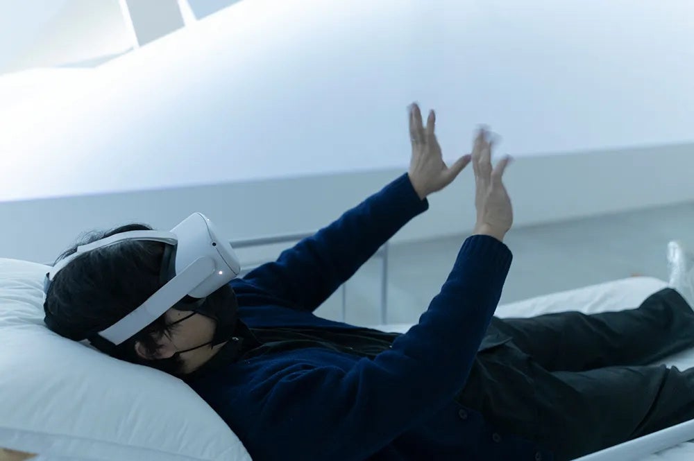VRや詩を用いて、感覚や世界認識の体系を組み替えることで生まれる芸術のあり方を探究してきたアーティスト・伊藤道史が、VIEが独自開発し提供する脳波デバイスを用いた新作を発表します。脳波デバイスとは、頭部に装着することで、脳の電位を取得し、感情や思考など脳の状態を取得できる器具です。昨今、脳波測定技術の進展や人工知能による人間の脳の学習の加速により、「脳とデジタル空間が直接繋がる」という想像が現実味を帯びようとしています。脳の中で思い浮かべた言葉やイメージを、読み取り出力する、あるいはある状況や記憶を脳に書き込み入力する。VR技術の先駆者アイバン・E・サザランドは「究極のディスプレイとは、物体の存在や物性そのものをコントロールできる部屋になる」という旨の言葉を残しましたが、本作では物理的な入力やコントローラーを伴わないインプットを通して、VR空間に鑑賞者が参加することを目指します。VRの作中では、脳の中にある今は亡き人の記憶に出会い、記憶を思い出すゆえにその記憶を歪め、忘れてしまう物語が上演されます。鑑賞者の脳の状況に応じて、ヴァーチャル空間での移動や演出が行われることによって、鑑賞者は寝そべったまま溶けて抜け落ちる床から、深層の世界へと入っていきます。脳波デバイスのハードウェア、ソフトウェア技術・開発協力はVIE.Inc。