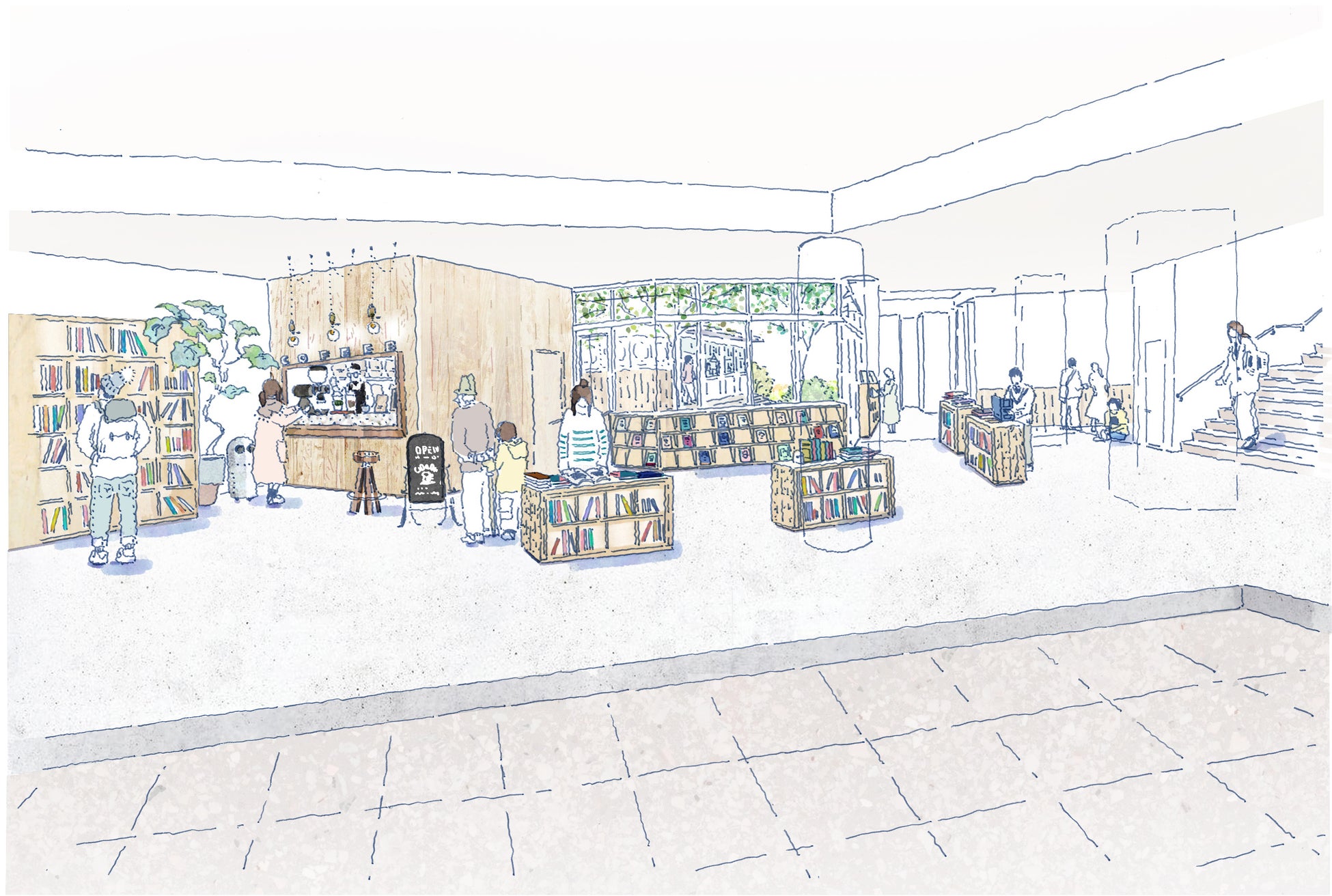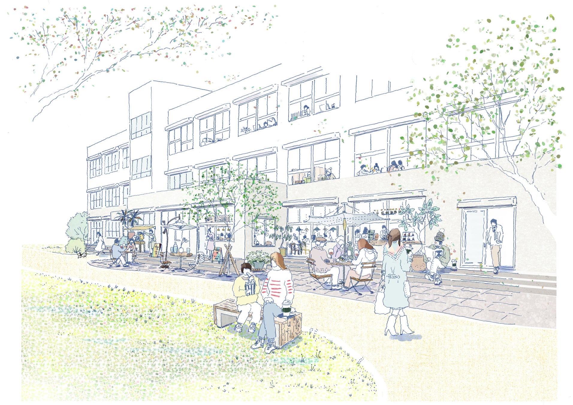 自分らしい暮らしをかなえる個人邸リノベーションから、事業用建物の再生、街のブランディングまで、ひとつひとつの「物語」に沿った住まいや暮らしを設計デザインを基点として提案する株式会社ブルースタジオが設計・監理を担当します。エントランスから続く広場を含むランドスケープは株式会社フォルクが設計し、植物と人とまちの関係をつくる都市の新しい入会地として、この場所に集う様々な人々の活動を支援する場、循環型地域づくりの起点を目指します。