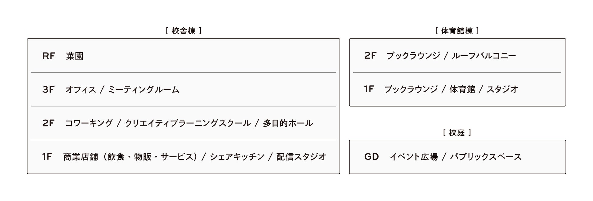 本施設は、校舎棟、体育館棟、広場という3つのエリアに分かれます。