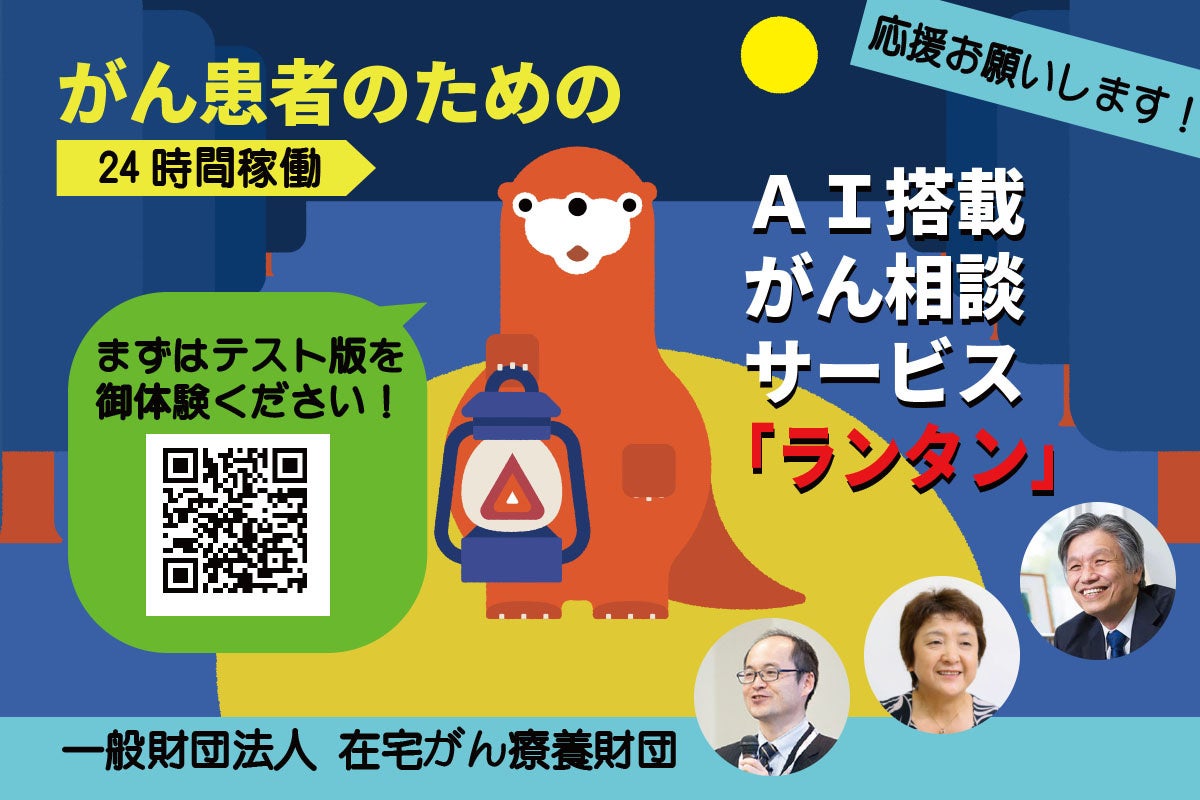 一般財団法人在宅がん療養財団(所在地:東京都世田谷区、理事長:渡邊清高)は、在宅でがんの療養をされる患者さんやご家族、それを支える医療従事者等のために、対話型のAI搭載がん相談サービス「ランタン」を開発、このたび最新β版を公開しました。在宅療養などで医師にすぐ相談できない患者さんも、専門家監修の信頼できるデータに基づき、24時間いつでも疑問や不安を解消できるサービスです。