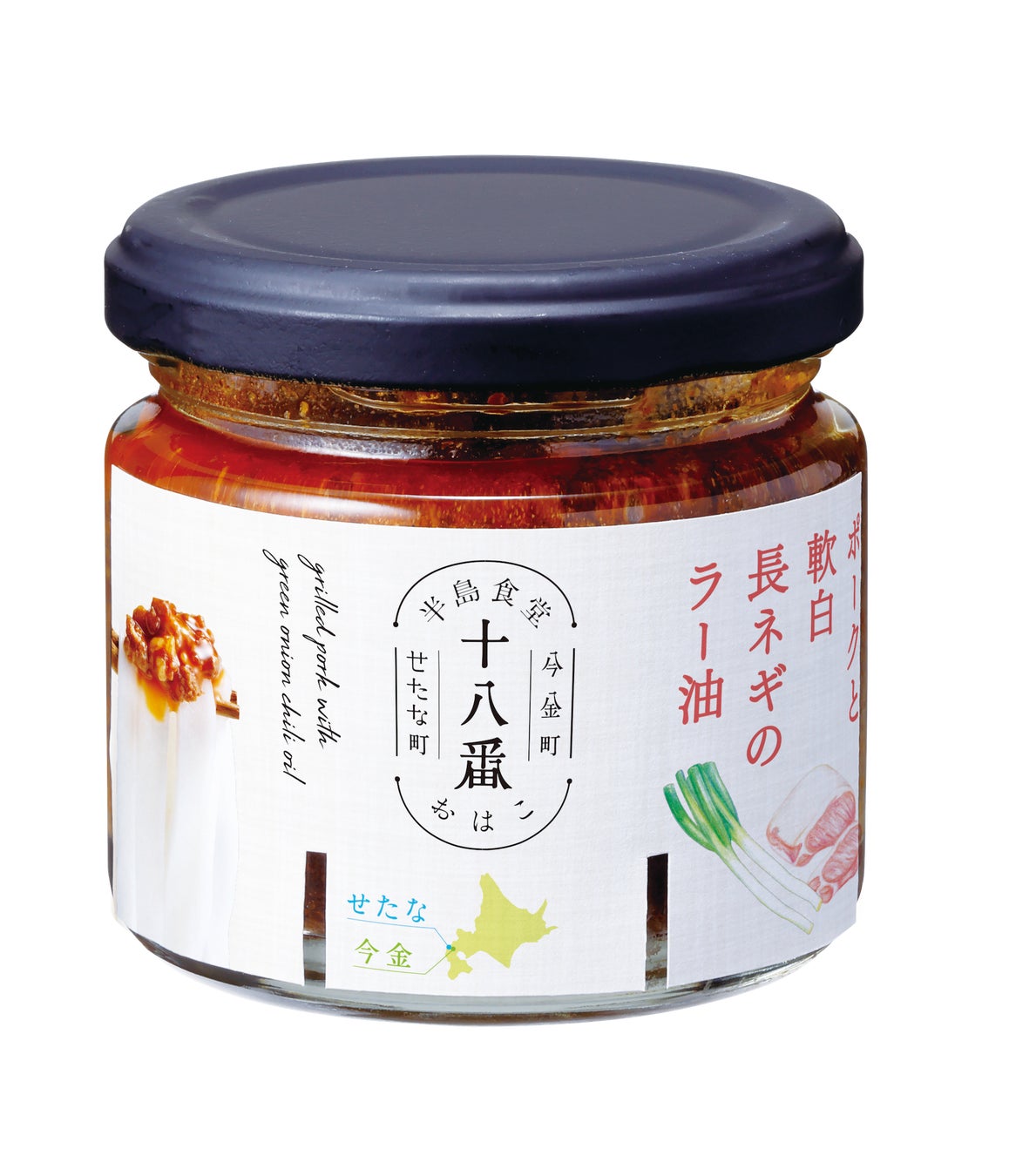 麺にもご飯にも合う万能調味料の食べるラー油。今金町産の特産の軟白長ネギと、せたな町産のブランドSPF豚肉〈若松ポークマン〉をたっぷり使い、軟白長ネギの甘みと豚肉のうま味がやみつきになる味わいです。
