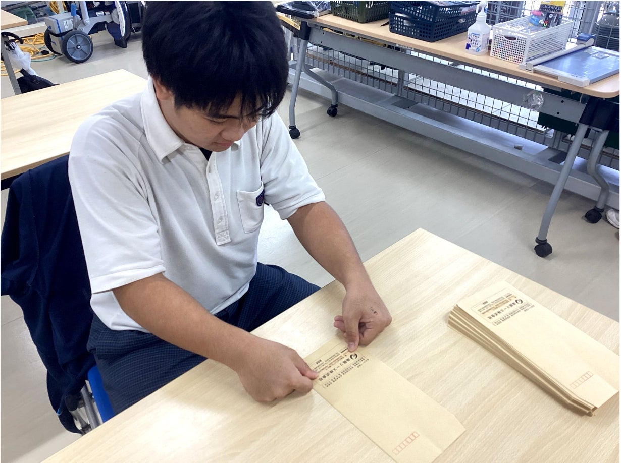 封筒は、生徒たちによる修正シールの貼付、仕分け、枚数確認などの作業が行われたのち、返送、納品されます。これら一連の作業は、職業能力の向上を図る作業学習、アビリンピック(オフィスアシスタント部門)の練習としての役割も兼ねており、まとまった量の封筒を教材として提供することで、学習の積み重ねに役立てていただきました。