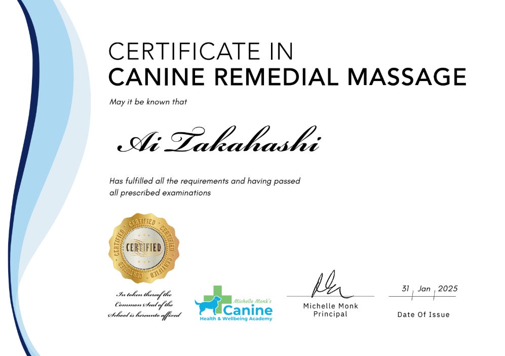 Certified Canine Remedial Massage Therapist(オーストラリア Canine Health and Wellbeing Academy)