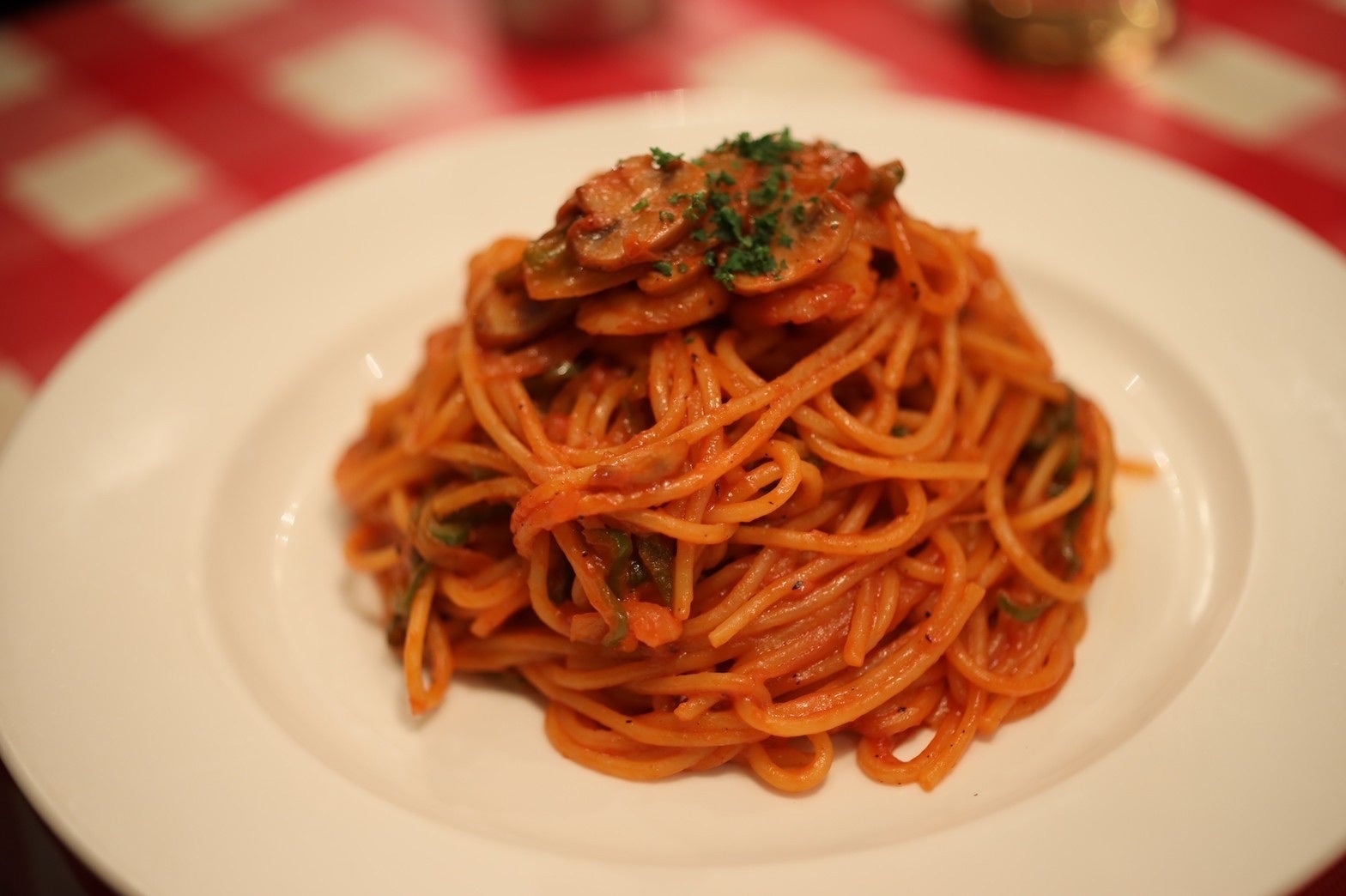 ナポリタン。もちもちとした太麺に、甘めのケチャップソースとバターの風味が絡み合い、どこか懐かしい味わいです。