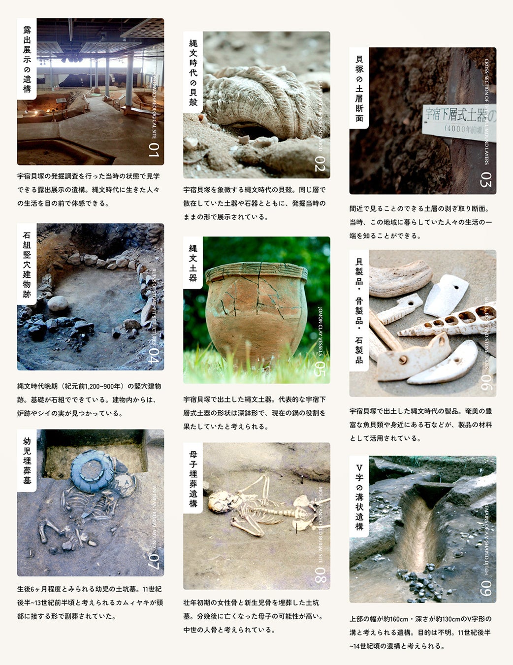 宇宿貝塚史跡公園(所在地:鹿児島県奄美市笠利町)は、主として縄文時代の遺構及び遺物で構成される国指定史跡「宇宿貝塚」を整備して平成16年(2004年)に開園した公園で、発掘調査で見つかった遺構などを展示する史跡保護覆屋施設と当時の海岸砂丘地形を復元した広場で構成されています。